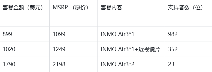 为覆盖不同用户的预算与需求,INMO AIR3在众筹期间推出三档梯度化套餐,降低用户决策门槛。