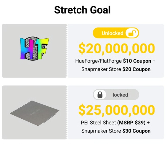 而在众筹金额突破2000万美元的里程碑后,Snapmaker进一步解锁延伸目标:为每位支持者追加HueForge的额外折扣券,以及Snapmaker Store的无门槛优惠券,既回馈了现有支持者,也刺激了后续订单转化。