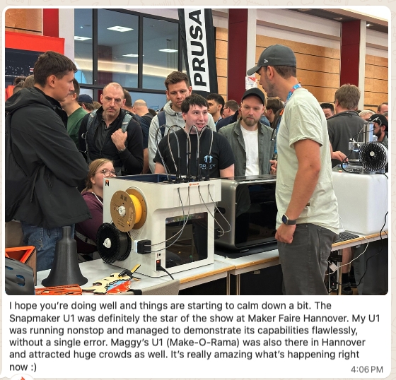 为让更多潜在支持者直观感受产品价值,测试人员还带着U1亮相多场国际公开活动:在德国汉诺威创客博览会(Maker Faire Hannover) 、PrintedHub及美国3DPrintopia活动中,设置体验区供参会者亲手操作。
